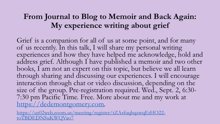 I have often felt I write “best” when I am sad. This feels like an odd thing to share, and it isn’t to say that I don’t enjoy writing about humorous or light topics. I have been thinking a lot about grief lately. I’ve been feeling it too, like so many of us at this time. Perhaps you will join me to learn a bit about my experience writing about grief, and to even share a few of your own thoughts. Free virtual Zoom event on Wednesday, September 2 from 6:30-7:30 pm Pacific Time.
