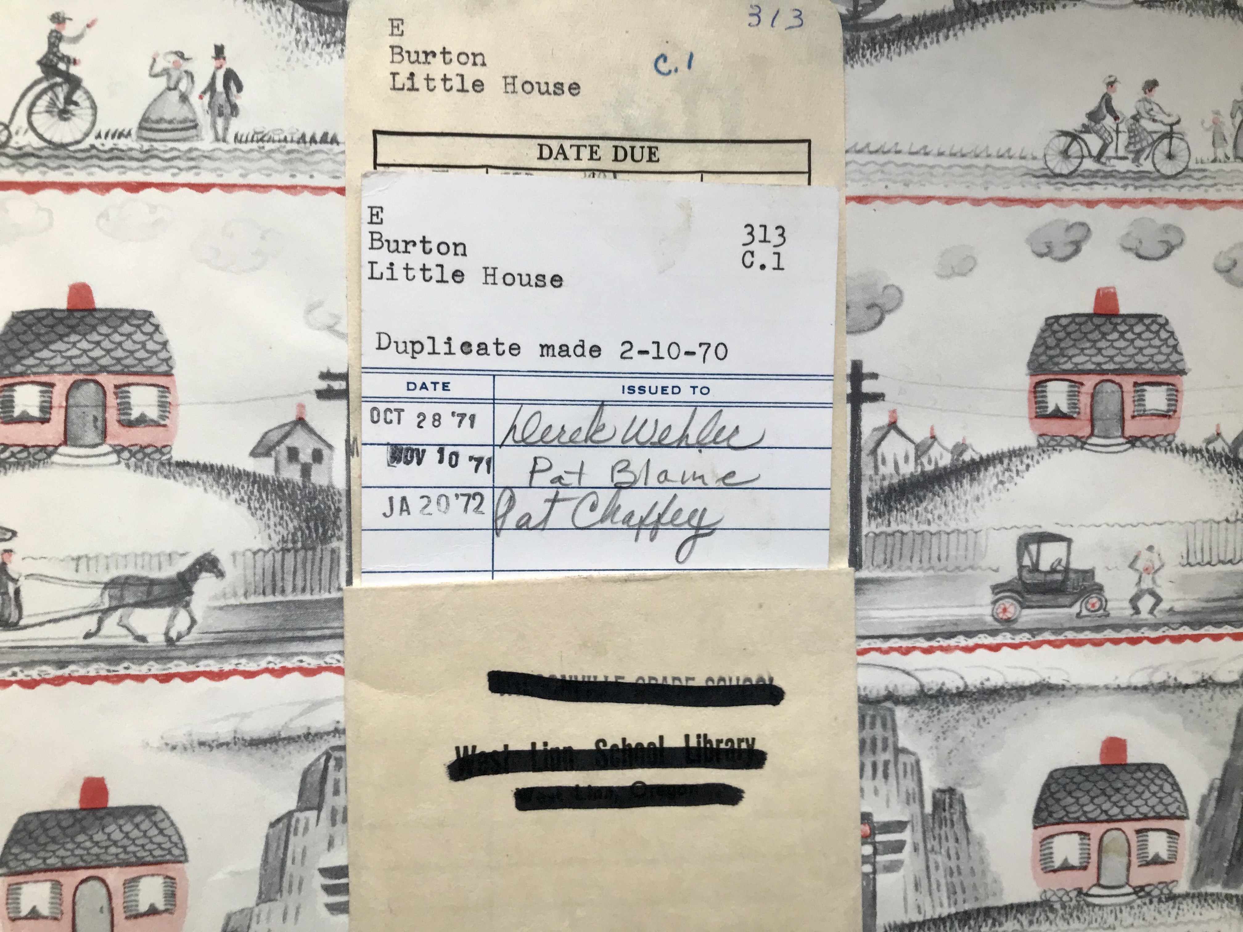 Hmm. Perhaps now isn’t the time to ask Mom about the library book I now hold in my hands – a copy of the The Little House written and illustrated by Virginia Lee Burton? Inside its front cover is pasted a pocket stamped both Wilsonville Grade School and West Linn School Library, both stamps blackened out by marker. The pocket still holds a card hosting several names and dates, the last entry dated January 20, 1972. I’d really like to know– was the library book simply misplaced and forgotten or was it a conniving act of outright thievery? Or, being the eternal optimist, I wonder if the school simply no longer wanted it, offering give-aways to relieve burgeoning shelves and make space for newer titles?