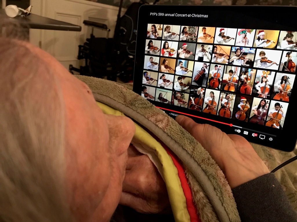 A partial remedy to the absence of live music during the pandemic is the potpourri of livesteamed opportunities. A silver lining for us, Mom would not be getting out to any of them even in the absence of a pandemic, nor would I. We have watched key arias of the Messiah in the kitchen while I baked sugar cookies, the Portland Gay Men’s Chorus Snowed In performance from the family room, and the Portland Youth Phillharmonic Christmas concert as Mom lay in her electric bed in our dining room, now transformed to bedroom. For as long as it is. Dad might remind us if he could: one day at a time.