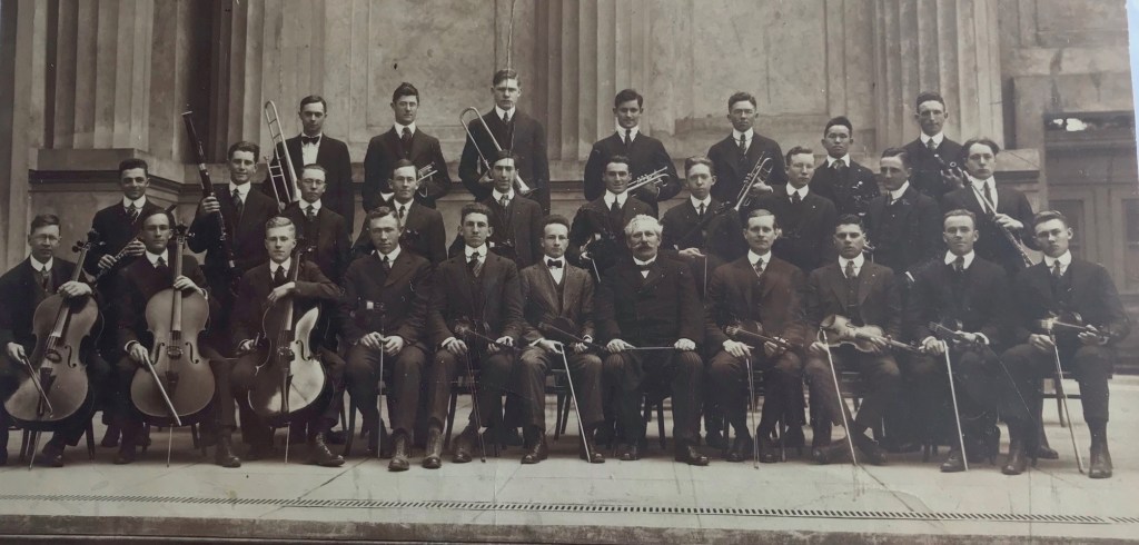 University of California Orchestra 1916, Paul Steindorf Conductor, Greek Theater. Richard Montgomery is first row, third from the left.