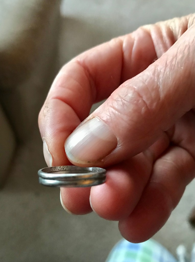 In a previous blog (You come back again and again) I wrote about the ring I received in the hospital after Dad died and before his body was transported. I slipped it on my finger and at first its look clashed with my minimalist style. Within an hour it felt part of me. The next week as we shared Dad’s ashes back to earth on our Long Beach Peninsula beach property, the ring slipped off my finger and I worried it to be lost, hidden in the dune grass. Dad chuckled somewhere, “Oh my Gumdrop.” I found it soon after and moved it to my middle finger where it still sits, six years later. That ring was the one our dad, perhaps impulsively, purchased at Portland’s Zell Brother’s, for his remarriage with our Mom, a contrast to his original 1950s gold band.
