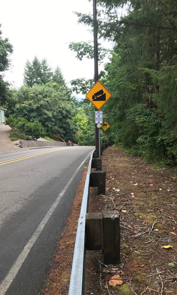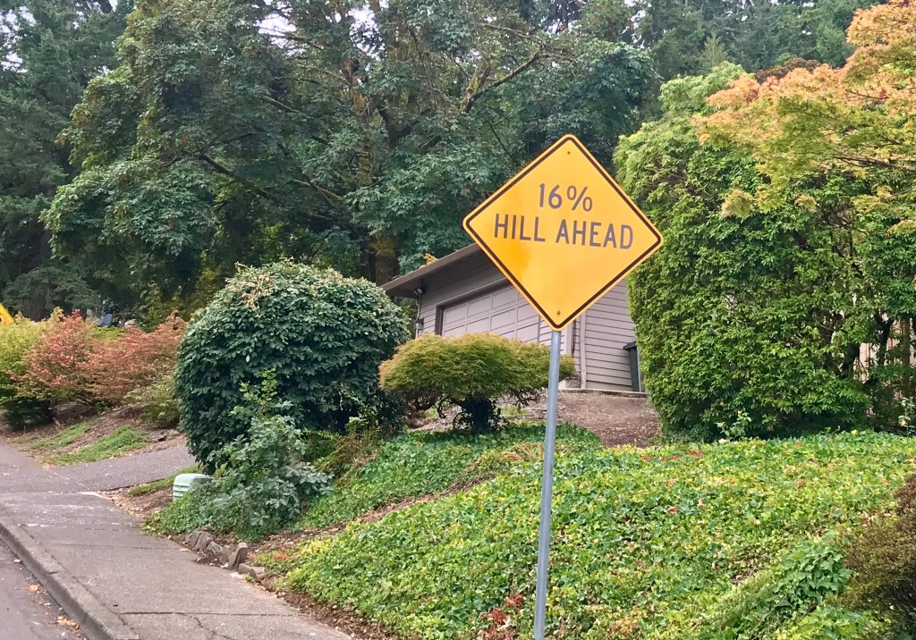 Yes, I did enjoy pedaling along the Willamette as I rode River Road into George Rodgers Park, peering down at one of my favorite kayaking river channels. Yet, every few minutes I’d sneak a peek at my power gauge and consider my options. Not quite my normal mindful commute. Yes, I could throw my bike on TriMet, but. Boring! I could leave my bike at work and bring in a charger another day. No fun. Oh, and I remembered, I was supposed to meet Russ and a friend or two outside after work at the Rhino down at the bottom of Hidden Springs at the end of the day. Further complications, and a few more extra miles, rather than cutting home my secret up-hill short cut. Now, I do love an adventurous challenge and asserted to myself I’d make this work. I used power to snake through Tryon Creek, following Terwilliger up to the top of where Terwilliger intersects Taylor’s Ferry. Then, I pulled over and powered off my bike, at the time thinking I’d coast down to Barbur Boulevard and then turn it back on. Yet, down at Barbur I thought – what the heck, I can do this to the next intersection and hill climb can’t I? Huffing a lot.