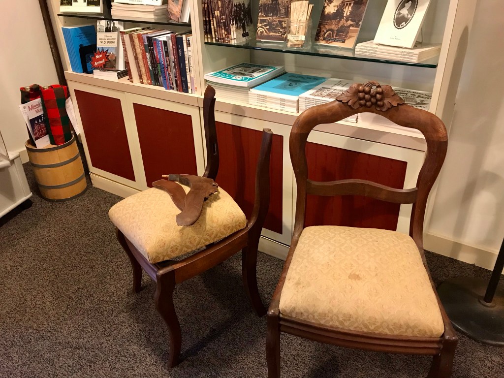 Did the chairs and table make that return trip with her? Nope. So far I have received differing opinions on the age of the chairs: one asserting they were from the early 1900s, while the other dates them as late 19th Century (later Victorian) like the table. Either way, neither the table or chairs, that we refer to as “Chloe’s” could have been owned by Chloe. Although Chloe moved from Salem to Northwest Portland with her daughter Frances and son-in-law J.K. Gill in 1871, she died in 1874. No longer is there anyone living who knows the truth about the chairs and table, and yet I am pleased to have delivered the chairs to WHC now, and will follow with the table: a final resting place in honor of Chloe and her Salem history, even if they were never actually hers.