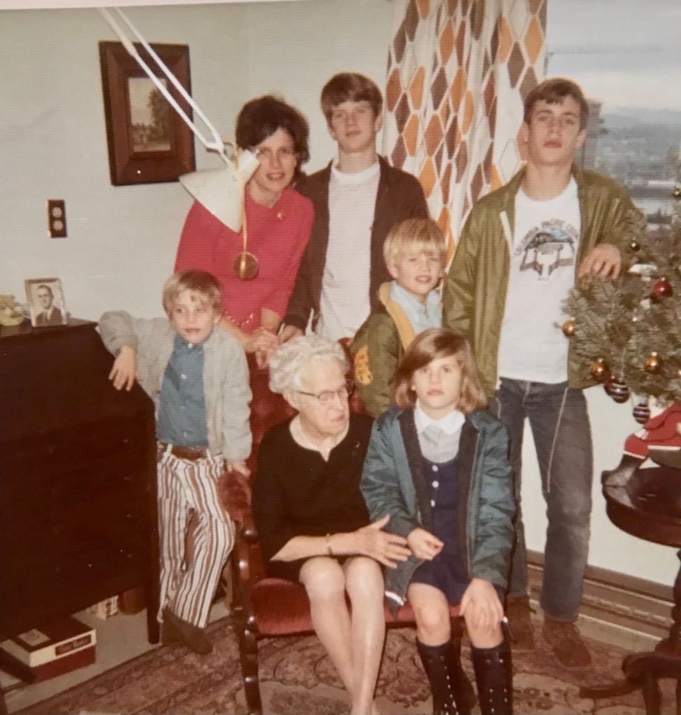 Dad’s cousin Ann speculates how at some point the furniture ended up with two of Frances and J.K.’s five daughters, Jessie and her younger sister Dorothy who also lived in Northwest Portland on 24th and Northrup. Jessie was divorced and Dorothy, who we called Dobbie, was widowed. Dobbie lived the longest of the Gill Sisters and when she downsized to Terwilliger Plaza, the chairs and table were given to Ann.
