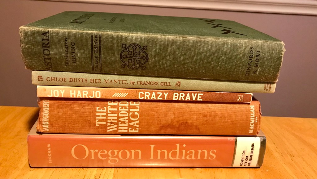 As I read the first chapters of Irving’s Astoria, I recognized I needed a buffer. Yes, I understand the era it was written, who wrote it, attitudes of the time. Yet, I decided to concurrently read two other books. The first I checked out from the library, Oregon Indians – Voices From Two Centuries, edited by Stephen Dow Beckham and published by Oregon State University Press. Second, I continued to read the book I had already started, Crazy Brave by Poet Laureate Joy Harjo (2012). I anticipated blogging about these books and their differing perspectives. Instead I found myself musing about how we pass on stories; the way those stories and their meanings change with the times.