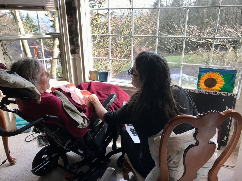 Then a regret pops up. I wish I had created ritual in washing Mom after she died. I wish I had dressed her fully in her favorite outfit. Before her body was taken from our home to be cremated. I didn’t think about it at the time because– at the time –it didn’t seem to matter. Mom had lost her attachment to clothing. Everything was about comfort. I remind myself it is OK. Maybe what it really is, is that I simply want one more moment to be with her. To take care of her. To love her. My regret dissipates. We had many many moments, and rarely does it feel like enough for us. I know Mom would tell me none of that matters: that we did all that matters. And, like Rebecca, our mom would remind us that we did what matters and even bigger than that to her is that we take care of ourselves too.