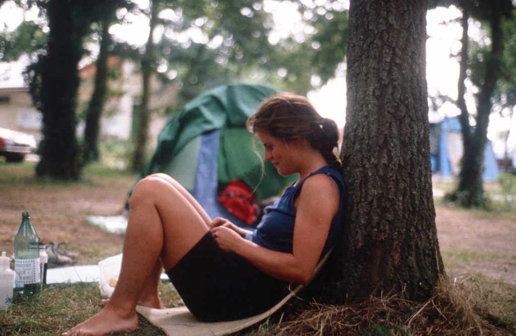 Dede at another 5 star accommodation. (Nope, not on a phone as we didn’t have those back then…not sure what I’m doing.) Our tent was tiny for two people, apparently so we could carry the weight of the cabbage and fresh veggies that Karen insisted on for dinner. At some fancier German campgrounds, people actually laughed and pointed at our tent staked in the middle of caravans and trailers.