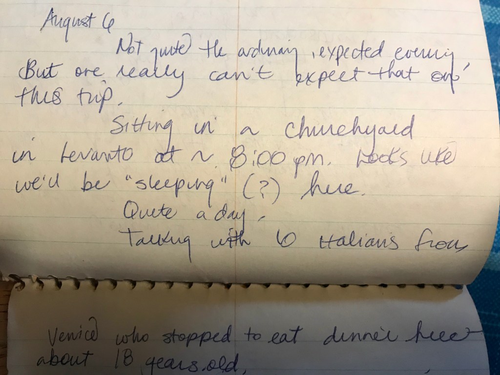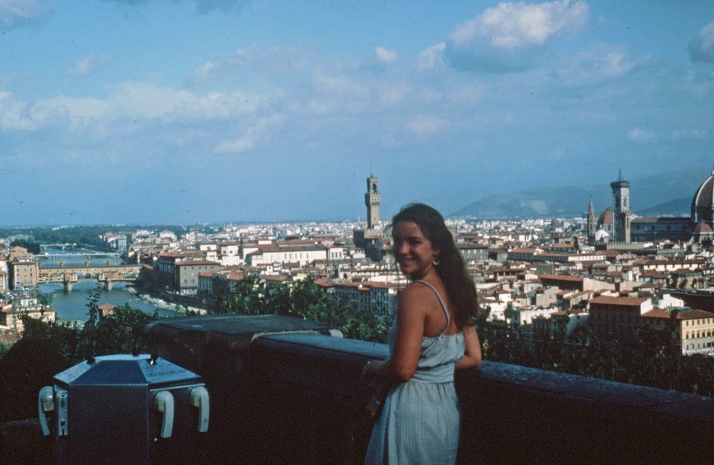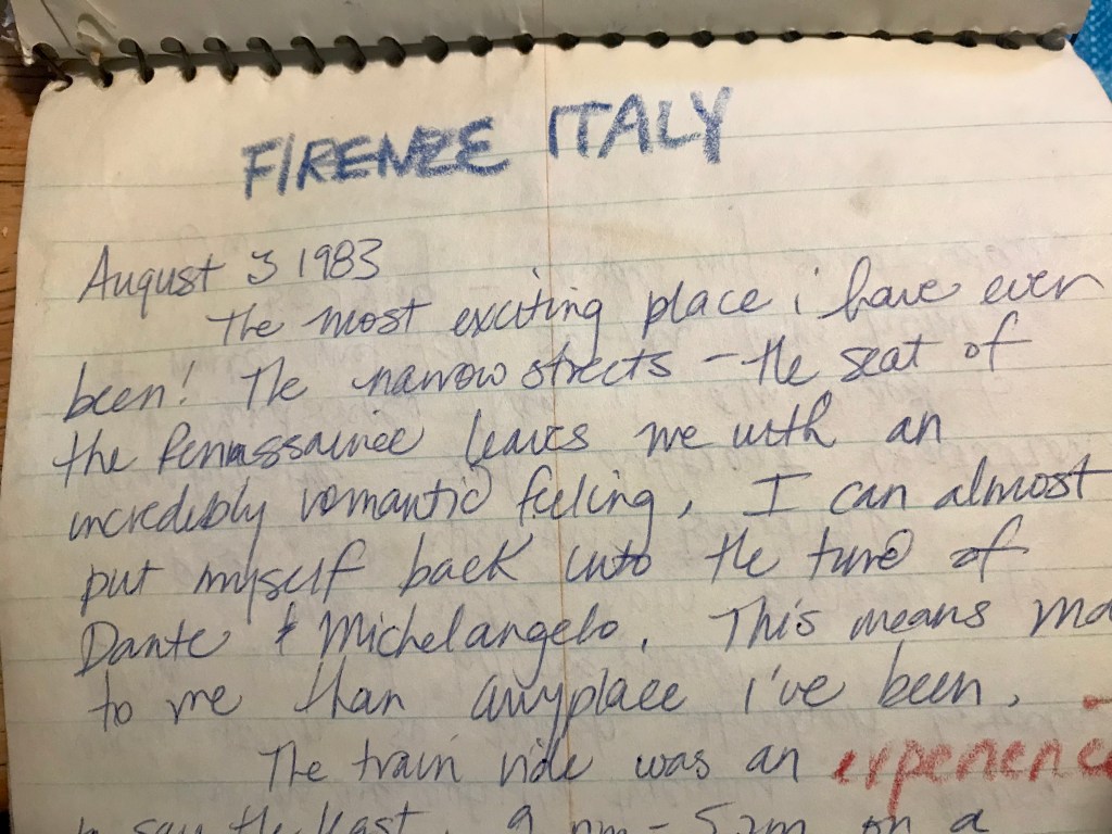 August 3, 1983, Florence, Italy. (Oh yes, the train experience – we’d been told we could sneak into a sleeper car but got caught in the middle of the night and found ourselves standing in the aisle with our panniers and belongings until we arrived in Florence. Florence was amazing even though we got bed bugs and we waited 4 days for our bikes to arrive.)