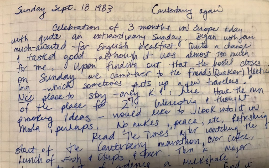 August 23, 1983, St. Georges, Auvergne, France (Russ was sending me beautiful love letters from home. I was reading one in a square in Cannes and crying, and an elderly man came up to me. Somehow we could converse and he told me I was too young to settle on one man yet. Note: Russ and I married in 1988 and are still married.)