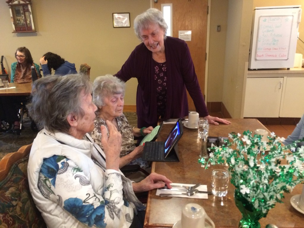 Patty and friends in dining room at Tanner Springs, St. Patrick’s Day 2018