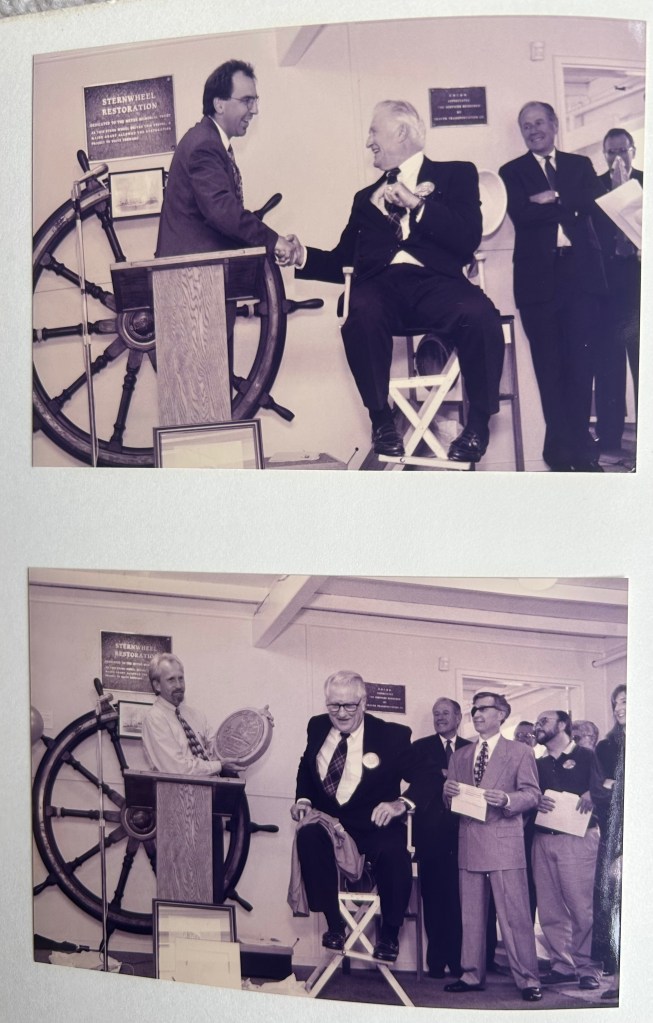 Dad retired from the Port of Portland in 1995, seven years after our parents remarried (each other). Although his work focused on the maritime side of the house, he was editor for the POP’s Portsmouth Biweekly publication. While I was embarrassed in 1979 when he inserted a photo of me serving chowder at Dan & Louis Oyster Bar after winning the POP ERAG Scholarship, today I appreciate the copies he archived. And Dad had two POP inspired or supported send offs celebrated on the Steamer Portland, best known as the Oregon Maritime Museum. First, his retirement from the Port. And second, unbeknownst to him perhaps, his 2014 memorial service.