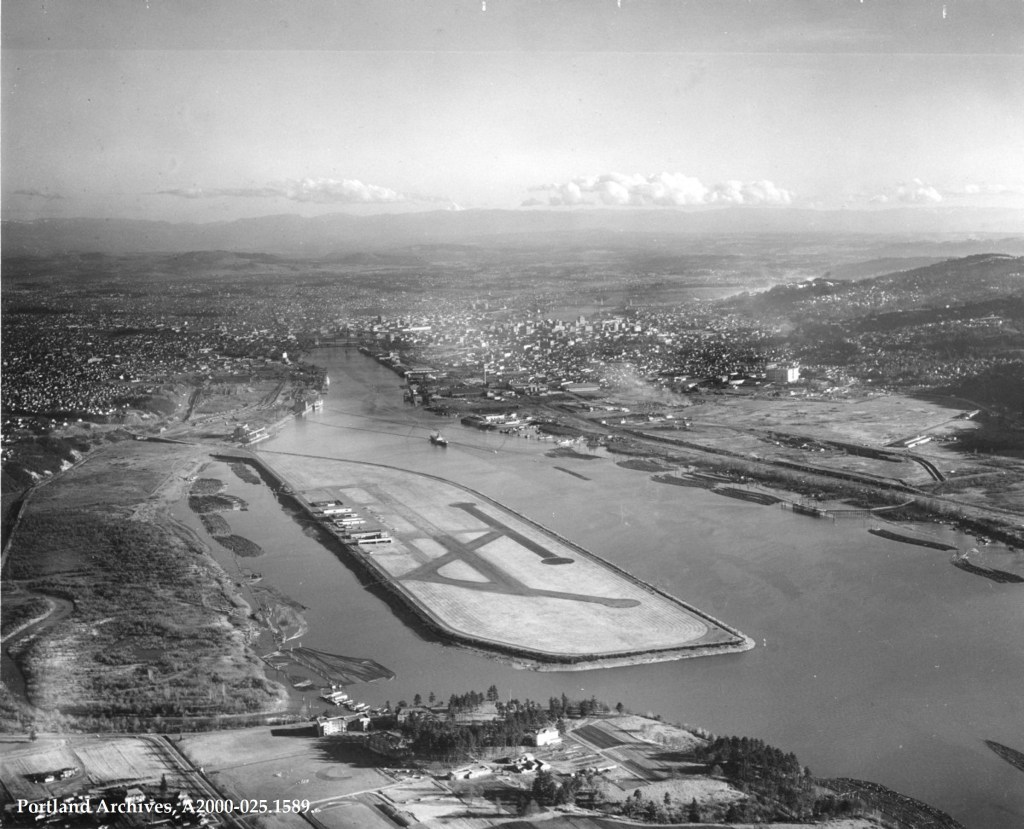 Portland’s Swan Island Airport in 1942. Image credit City of Portland (OR) Archives, A2000-025.1589.