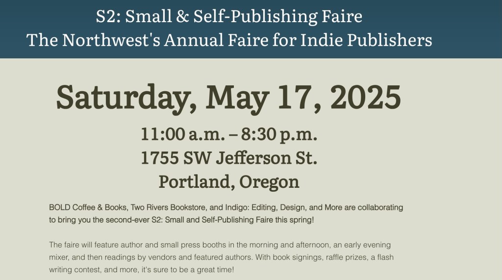 Even without social media, you can subscribe to my blog by email on my home page, peruse posted content organized in categories, or view my books. Visit at https://dedemontgomery.com. Many authors you might already enjoy (and new ones you’ve not yet heard of) have active blogs on their websites – check them out. While you’re at it, looking for new authors and books? Friends in the Portland-Metro area, please join me and 39 other local authors and small presses at the S2 Book Fair on Sat., May 17 held at Bold Books and Coffee! Hey, I’d even see you in person! That beats virtual channels any day!