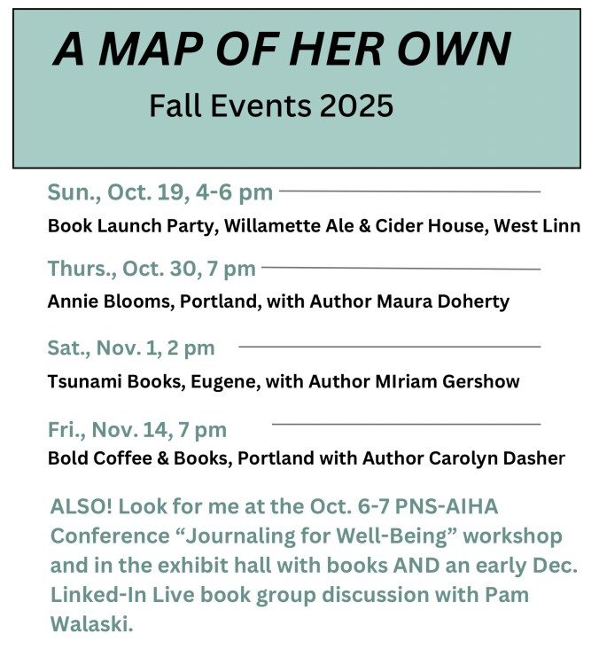 Just as I figured I was done attending professional conferences, favorite activities in my past, I got an invite to join this October’s Northwest Occupational Health Conference. While I will miss not seeing my retired friends who once attended, I am eager to better get to know those newer to the field. I appreciate the conference planning team who invited me to give a keynote address, lead a workshop on journaling for well-being, and even have my (non-industrial hygiene or public health) books available in the exhibit hall! I’ll also encourage pre-orders for A Map of Her Own as it will release the following week. Heading to Bremerton? Please find me!