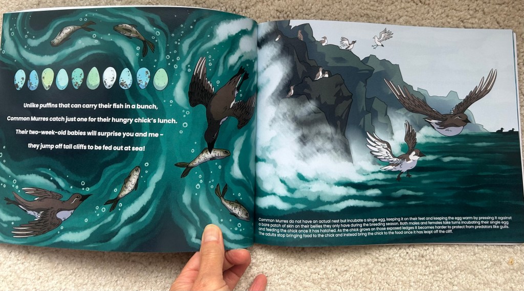 Jay and family have been neighbors of ours for years. In fact, our daughter was a long ago babysitter of theirs. We’ve followed and shared the various touchpoints of our lives; sadnesses and joys. Earlier in the year, Jay and I had coffee and contemplated the challenges and thrill of getting a new book into the world. I tried to share a few tips, knowing I am still learning. Our next visit was over tea as he shared this remarkable book. What makes it remarkable? Beyond the beauty of the illustrations? Beyond the rhymes, facts and learning captured within this small package? To me, I love its collaboration: Jay, a now retired public educator, invited twelve prior students to illustrate two pages each of the book. Or more simply, a bird apiece. From tufted puffins to common murres, marbled murrelet to common loon, and more. Dear to my heart is how Jay, a longtime science and statistics teacher at Wilsonville High, invited these artists who represented Wilsonville High classes of 2000-2022, Yes, this a high school built within the forests of my youth.