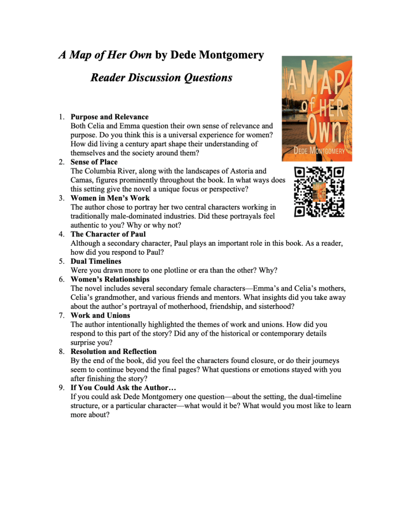 With that background, I encourage you to invite me to a book group to discuss any of my books, including A Map of Her Own. I’m now setting up dates for 2026. I have joined book groups for each of my books over the last few years. While I prefer in person, distance makes that impossible for those from afar, and virtual works too. I have generated book discussion questions for several books and share them below. Oh, and in case I’ve fooled you into thinking I’m more popular or famous than I really am, of course there is no charge. (For local folks, I have a special deal for A Map of Her Own: signed copies at $3 off the $16.95 retail if you buy at least three and pick them up or we come up with a designated meeting spot.)