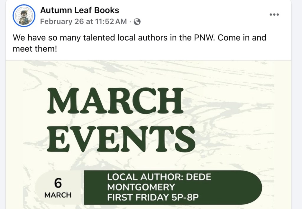 2. Autumn Leaf Bookstore Signing, Camas First Friday, Friday, March 6 from 5-8 pm.