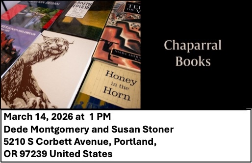 3. In Conversation with Author Susan Stoner, Saturday, March 14, 1-2 PM, Chaparral Books, 5210 S. Corbett Avenue, Portland, Oregon.