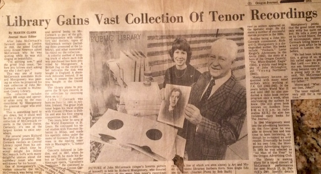 St. Patrick’s Day reminds me of my grandfather, Richard Gill Montgomery, Sr. Our Daddy Dick was an author and historian (The White-Headed Eagle among others) and, like Dad, a storyteller. He was on track to become a doctor when he found, after working in his grandfather’s J.K. Gill store one summer, to be better suited to be a man of words and books, later establishing a Portland advertising agency. He offered radio book chats on the side. And wrote his own. Yet, my favorite story this time of year is about his Multnomah County Library St. Paddy Day concerts.