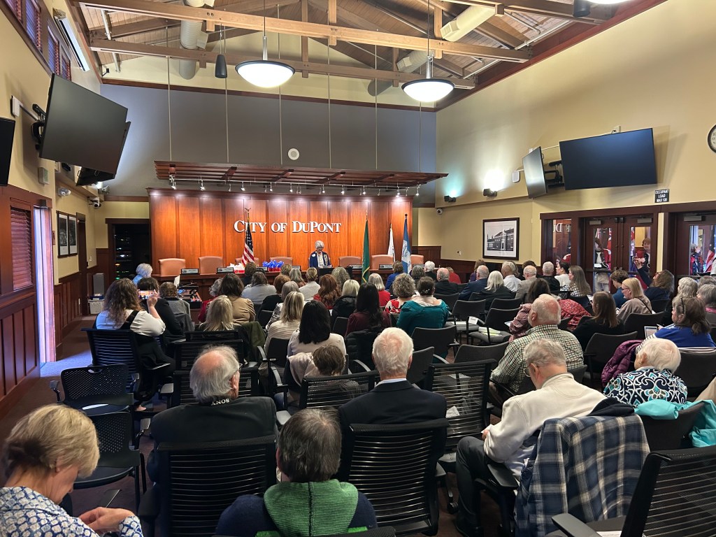 But, back to Chloe. Unlike the Montgomery side of family, Chloe Clark came from deeper early America roots. Our shared ancestor, Thomas Barber, was born in 1624 in England and immigrated with his wife Jane to Windsor, Connecticut in 1625. Yes, a long time ago. It is because of this lineage that I recently received a surprising phone call request, the caller finding me through my blog. A group of women in Dupont, Washington were founding a chapter of the Daughters of the American Revolution (DAR) named the Chloe Clark Chapter! And yes, they invited me to be a founding member. What followed were a number of discussions and for me to come up to speed on DAR, an organization I knew of but hadn’t ever thought much about. To keep it simple, I’ll summarize by saying that I have not joined the organization but was pleased to attend their celebration of the founding of the Chloe Clark Chapter at Dupont, Washington City Hall.