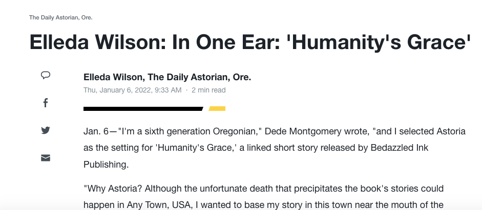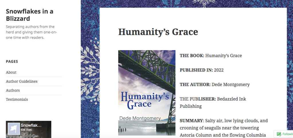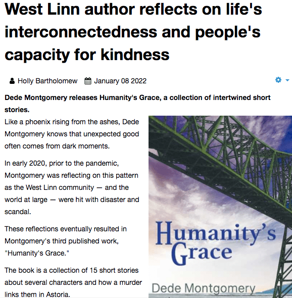 Local author panel hosted by West Linn Public Library, Crafting Short Stories, March 12, 20222Learn more about Humanity’s Grace, the writing of the book and the author at Snowflakes in a Blizzard. Find other good reads too.Latest press on Humanity’s Grace from the West Linn Tidings (1/8/22). Thanks to Elleda Wilson. Check out this article in The Daily Astorian’s In One Ear(1/6/22).Thanks to Women Writers, Women(‘s) Books for sharing my piece about my newest release on January 1, 2021. Check out Releasing Humanity’s Grace: Creating Stories, Selecting Genre.Thanks to Sue Bavey for sharing an interview with me on her Indie Spotlight. Read the interview.